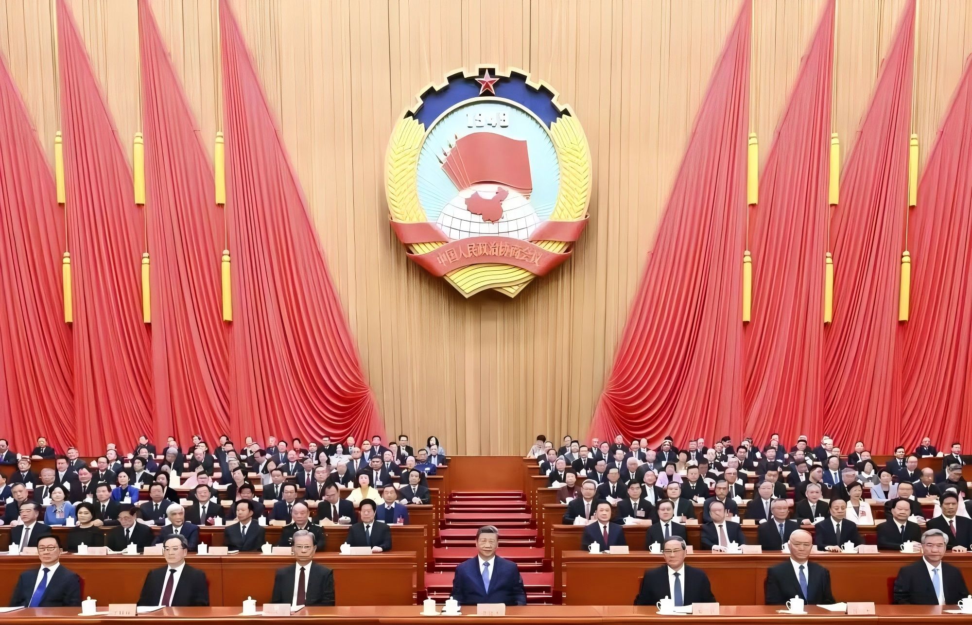 三月的北京,春启华章。人民大会堂大礼堂灯光璀璨,气氛隆重热烈。中国人民政治协商会议会徽悬挂在主席台正中,十面鲜艳的红旗分列两侧。