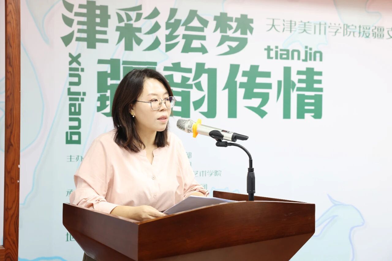 大家好!我是新疆策勒县固拉合玛镇中心小学驼铃艺社的负责人冯娜。非常荣幸能站在这里,代表策勒,代表我们的孩子们,向咱们天津美术学院致以最诚挚的感谢!