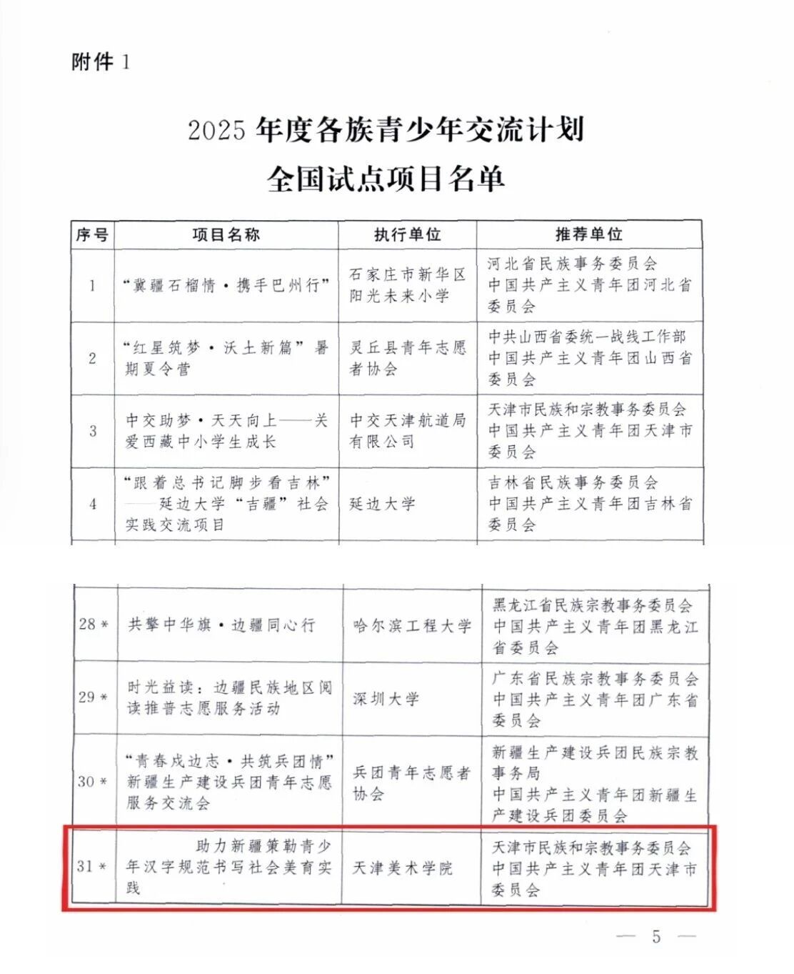 近日,从国家民委获悉,我校申报的《助力新疆策勒青少年汉字规范书写社会美育实践》项目,经国家民委专家评审、部门会商、会议审议等程序,被评选为2025年度各族青少年交流计划全国试点项目。全国共评选出试点项目45个。